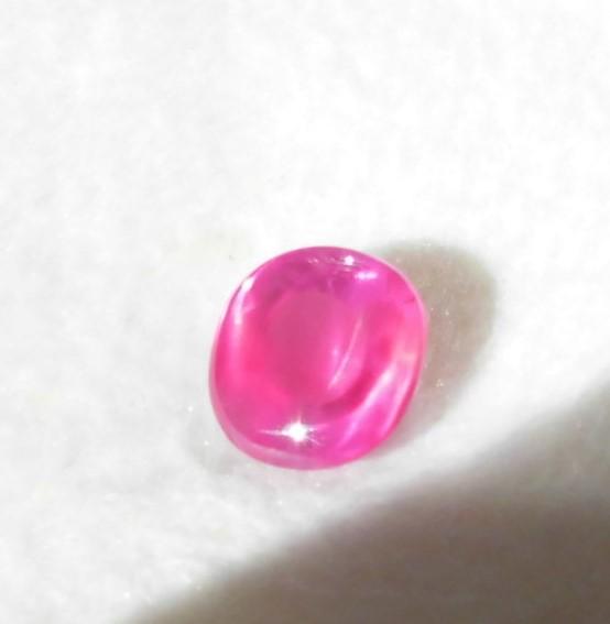下の写真は カボッション2.77ct 非加熱 モゴック産ピンクサフアイア 、アステリズム効 果あり。透明度の非常に高い、且つ規則正しく並んでいるシルクが多いのでカボッション側から直線スター、平面側からは両端に細い三日月スターが出る。そこがこの石の魅力。2.77ct 、280万円 カボッション側からみればルビーに近い。